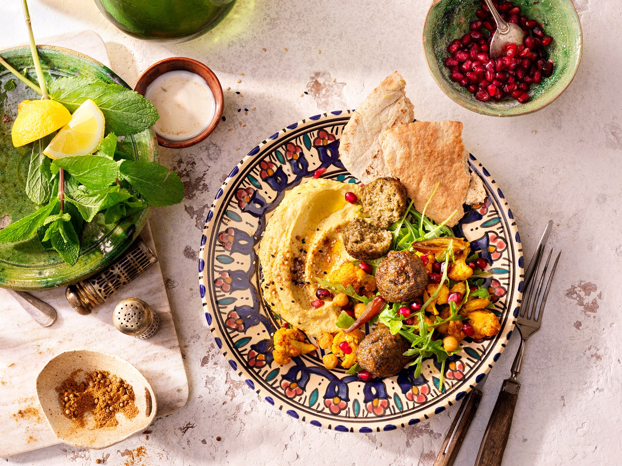 Bland blomkålen med rucola, kikærter, dadler og valnødder og fordel på tallerkener eller på et fad. Anret de bagte falafler ovenpå og pynt med granatæblekerner, tahindressing og mynte.
