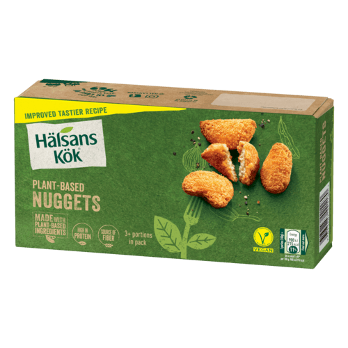Hälsans Kök Vegan Nuggets er en velsmagende snack eller tilføjelse til et plantebaseret måltid for både børn og voksne. Server med pommes frites eller kartofler og dine foretrukne grøntsager – nemt og lækkert!